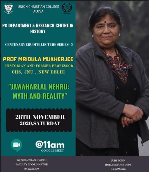 The fifth Centenary Erudite Lecture Series by the Department of History shall be delivered on 28 November 2020 @ 11.00 AM by Prof. Mridula Mukherjee.